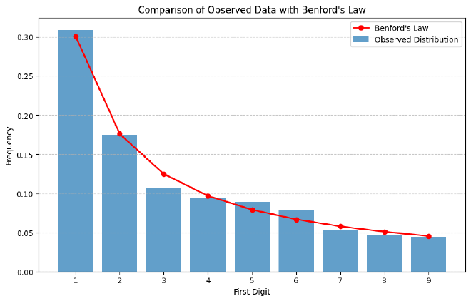 I decided to analyze this list of transaction amounts against Benford’s Law, which describes an interesting relationship that is often found in long lists of ‘real-life’ numbers. It concerns the frequency with which each digit between 1 and 9 appears as the first digit of the numbers. In real-life data, Benford’s Law states that the frequency with which digit \(d\) between 1 and 9 appears as the first digit is roughly: