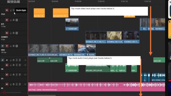 - The top-most video track plays over tracks below it. The top-most audio track plays over tracks below it. Of course you can adjust transparency or audio levels to get interesting effects.