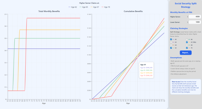 With liberal use of Vibe Coding, I created this Social Security Split Strategy web app to help me analyze the particular split strategy situation that was relevant for me. The app implements the Social Security rules as I understand them, and also has additional ‘situational’ assumptions coded into the app. The app itself is written in TypeScript and uses the React framework.