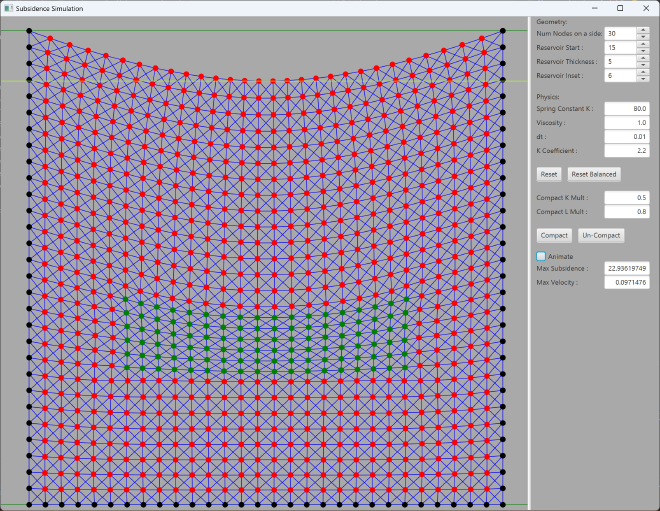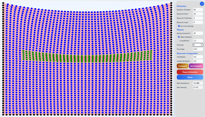 The subsidence app simulates a 2D matrix of point masses that depicts a cross-sectional view of a reservoir, the rock around it, and the ground above it. The nodes should be considered to be little bits of rock, and they are connected to each other with simple springs that stand in for the forces (pressure) that each bit of rock feels from surrounding bits of rock. Using a simple Hooke’s Law linear spring force is a gross simplification of how rock really behaves, but it can perhaps be defended as a first-order linear approximation. The masses in the simulation are subject to gravity, so the springs compress and the masses bounce around a bit until they come to an equilibrium, balancing the tension in the springs against themselves and against gravity. Compaction in the reservoir is crudely simulated just by suddenly reducing the spring constants and at-rest lengths of the springs within the reservoir, which causes subsidence at the surface.