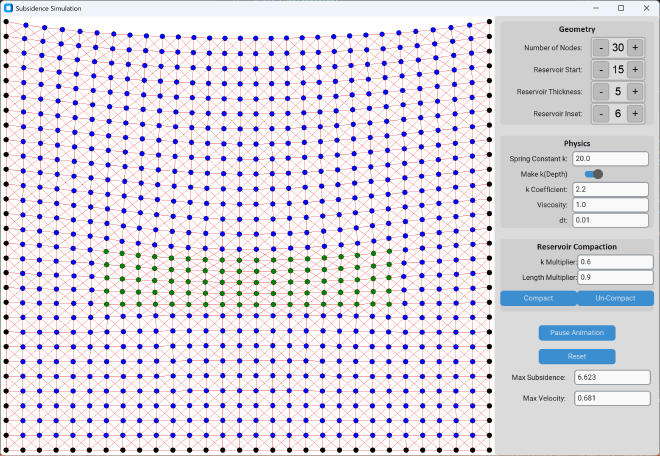 The subsidence app simulates a 2D matrix of point masses that depicts a cross-sectional view of a reservoir, the rock around it, and the ground above it. The nodes should be considered to be little bits of rock, and they are connected to each other with simple springs that stand in for the forces (pressure) that each bit of rock feels from surrounding bits of rock. Using a simple Hooke’s Law linear spring force is a gross simplification of how rock really behaves, but it can perhaps be defended as a first-order linear approximation. The masses in the simulation are subject to gravity, so the springs compress and the masses bounce around a bit until they come to an equilibrium, balancing the tension in the springs against themselves and against gravity. Compaction in the reservoir is crudely simulated just by suddenly reducing the spring constants and at-rest lengths of the springs within the reservoir, which causes subsidence at the surface.